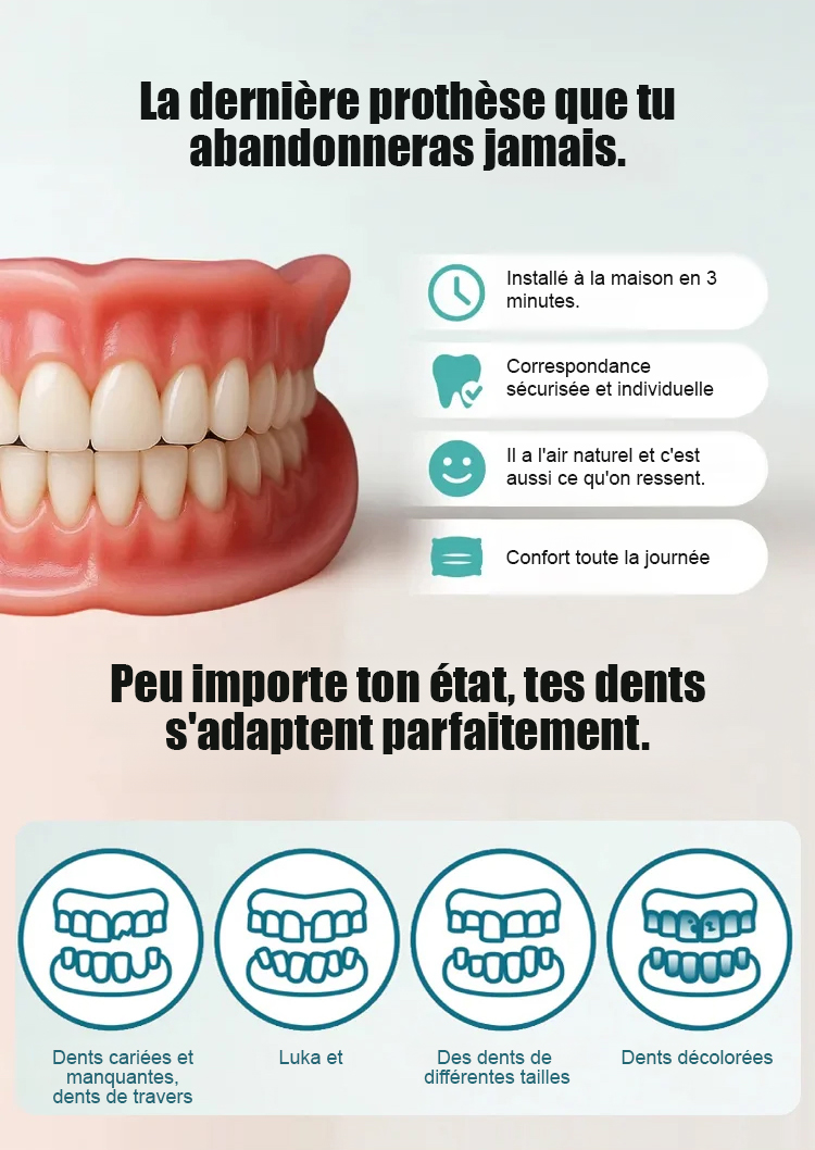 ✨ Vous avez des dents manquantes ou des espaces entre vos dents ? Notre kit de sourire flexible à faire soi-même révolutionne l'esthétique dentaire à domicile. 🥕Grâce à la technologie thermoplastique, le matériau s'adapte parfaitement à votre mâchoire une fois plongé dans l'eau chaude, créant ainsi un aligneur stable et d'apparence naturelle. Vous pouvez boire, manger et même croquer dans des pommes bien dures en toute simplicité. 🍃 Réutilisable et résistant aux taches, ce produit offre un confort optimal sans colle.