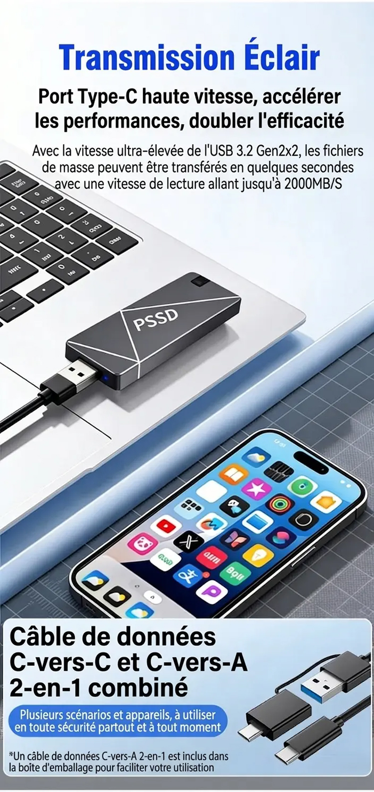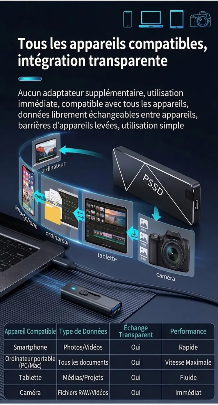 📱 Compatibilité Totale : USB 3.2 Gen 2, Type-C, iPhone, Android, PC/Mac.